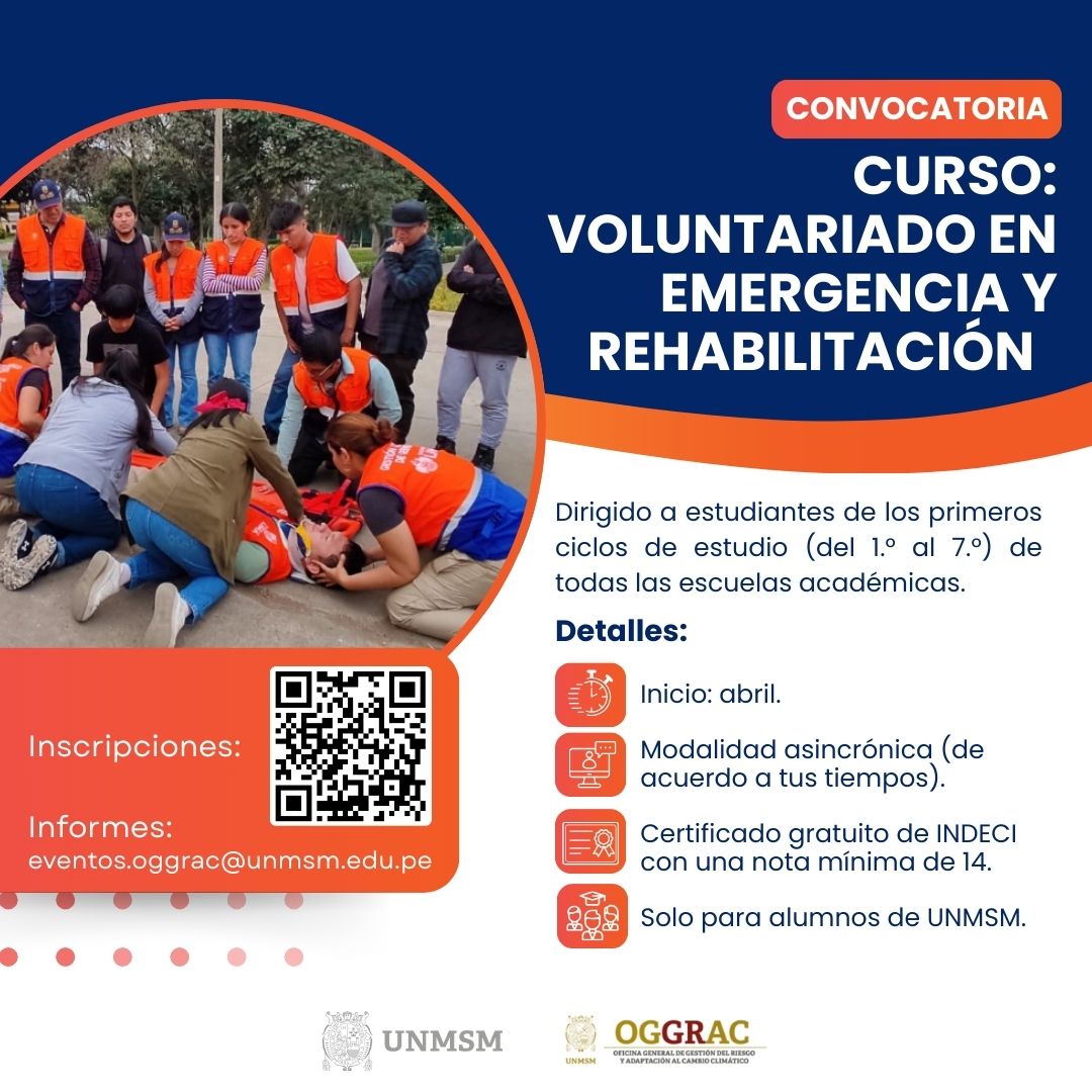 ¡Atención, estudiantes de la UNMSM! 📢 Si estás en los primeros ciclos (1.° al 7.°) y te interesa el voluntariado en situaciones de emergencia y rehabilitación, esta es tu oportunidad. ¡Vuélvete un voluntario! DETALLES DEL CURSO: Fecha: Abril Modalidad: Asincrónica Dirigido a: Estudiantes del 1.° al 7.° ciclo de todas las escuelas de la UNMSM Certificado: […]
