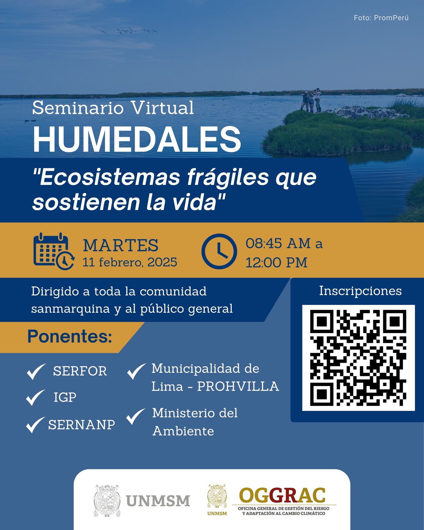 La Oficina General de Gestión del Riesgo y Adaptación al Cambio Climático (OGGRAC) de la UNMSM tiene el agrado de invitar a la participación del seminario:  “Seminario Virtual: Humedales: Ecosistemas frágiles que sostienen la vida” Este espacio busca promover la reflexión y el fortalecimiento de conocimientos sobre la importancia de los humedales, destacando su papel […]